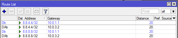 La tabla de rutas del Mikrotik A se encontraría así: